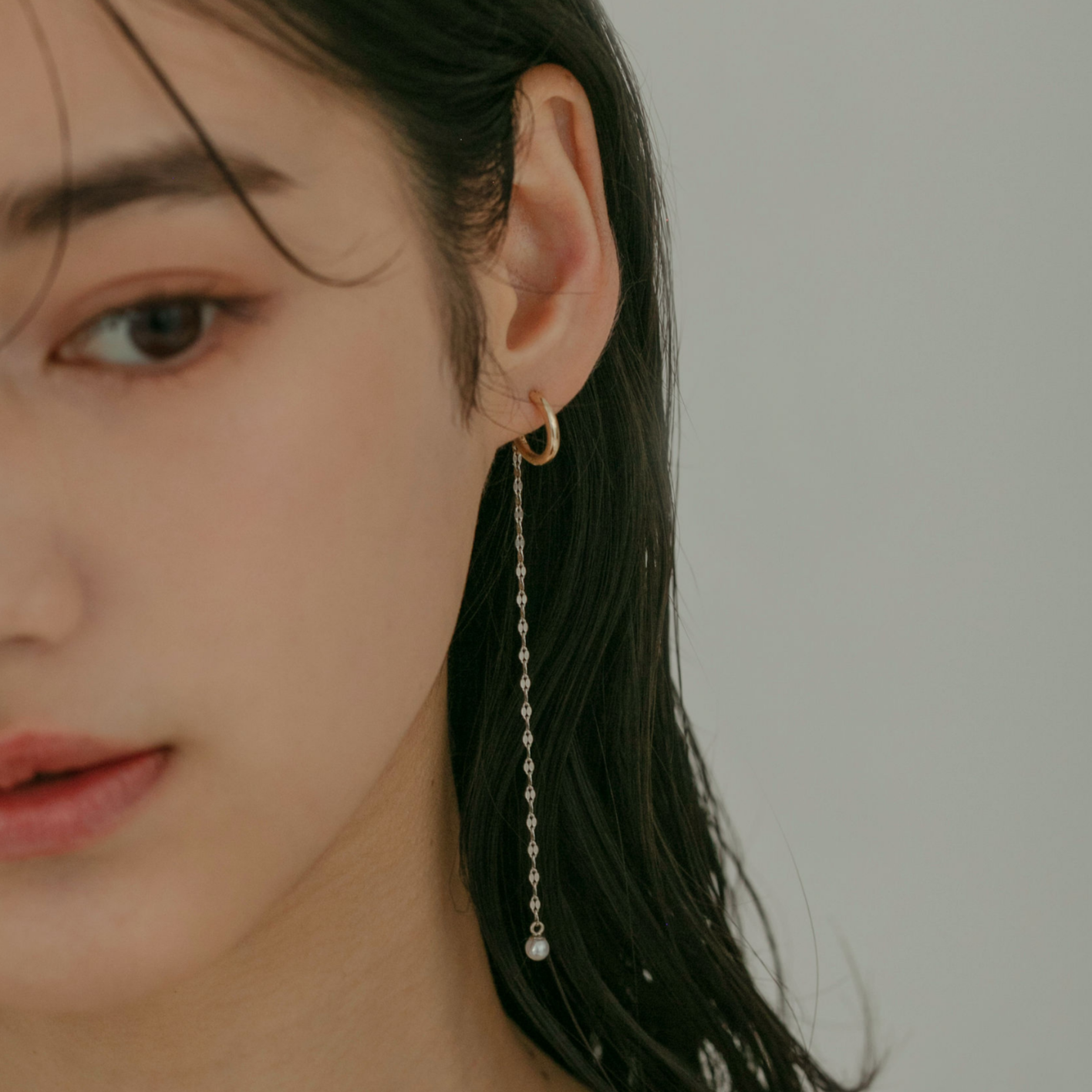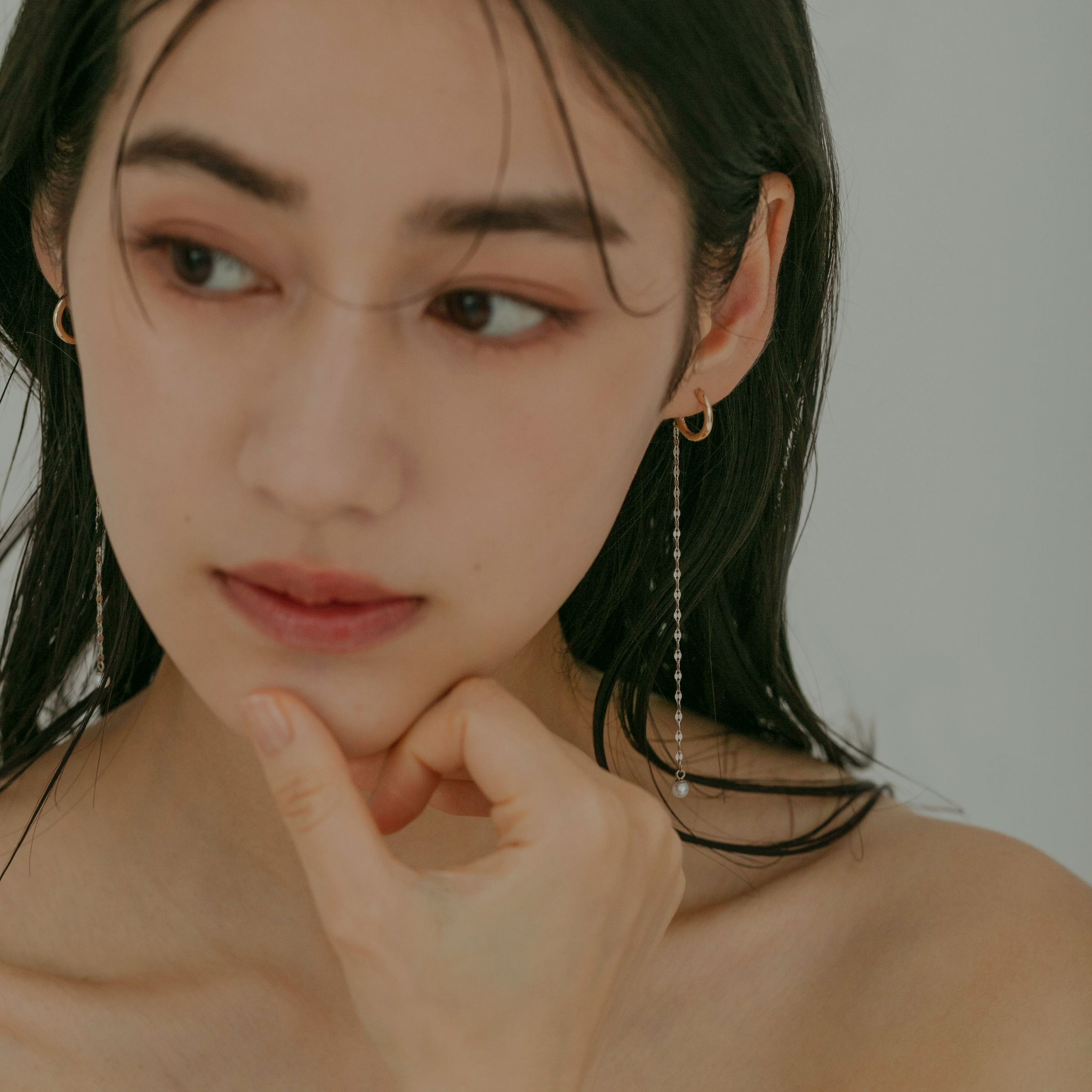 「幸せは連鎖する」 チェーンをメインにデザインされた連鎖・つながりがコンセプトのシリーズ。 デザインチェーンが揺れ動いて笑顔が生まれるとき、きっとあなたの周りも明るくなるはず。 シンプルフープから輝くロングチェーンの先にはキュートサイズのパール。 女性らしさをアップさせるアイテムです。